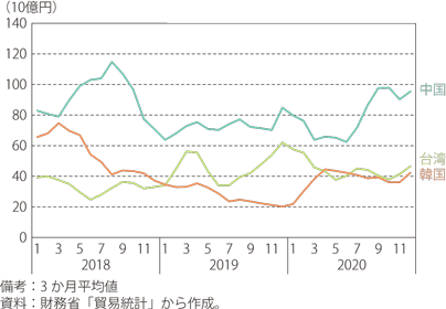 続いて、半導体等電子部品の輸出動向を見ると、2020年1月に輸出額上位3か国はともに輸出額が減少したが、その後は目立った動きは見られない(第Ⅰ-2-4-9図)。