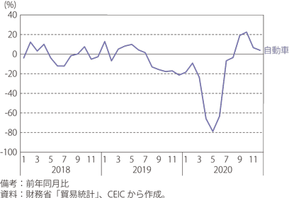 また、月別で見ると、原油をはじめとする資源価格の下落や新型コロナウイルスの感染拡大を受けた感染症緊急事態宣言の発出による消費の抑制・需要の減少により、年間を通して前年を下回る水準で推移している(第Ⅰ-2-4-12図)。