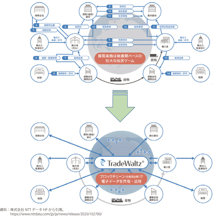 一方、先にふれた欧米の動きと同様、国内でもブロックチェーンを活用した貿易業務のデジタル化が進捗している。2020年4月、7社104が共同出資した業種横断の企業コンソーシアム、「TradeWaltz(以下トレードワルツ)」が設立された。事業内容は、ブロックチェーンを活用した貿易情報連携プラットフォーム「トレードワルツ」のSaaS(Software as a Service)提供・運営であり、従来は「壮大な伝言ゲーム」だった貿易業務を、業界横断で一元的に電子データにより管理することを目的としている(第Ⅱ-1-5-14図)。