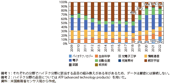 品目別で確認すると、2018年には約47%を占めていた「航空宇宙」が2020年以降は約13~15%までシェアを落としている一方、「バイオテクノロジー」は増加傾向にある。どの品目においても今後米国の輸出規制の対象となる可能性があり、引き続き注視が必要である(第I-1-5-9図)。