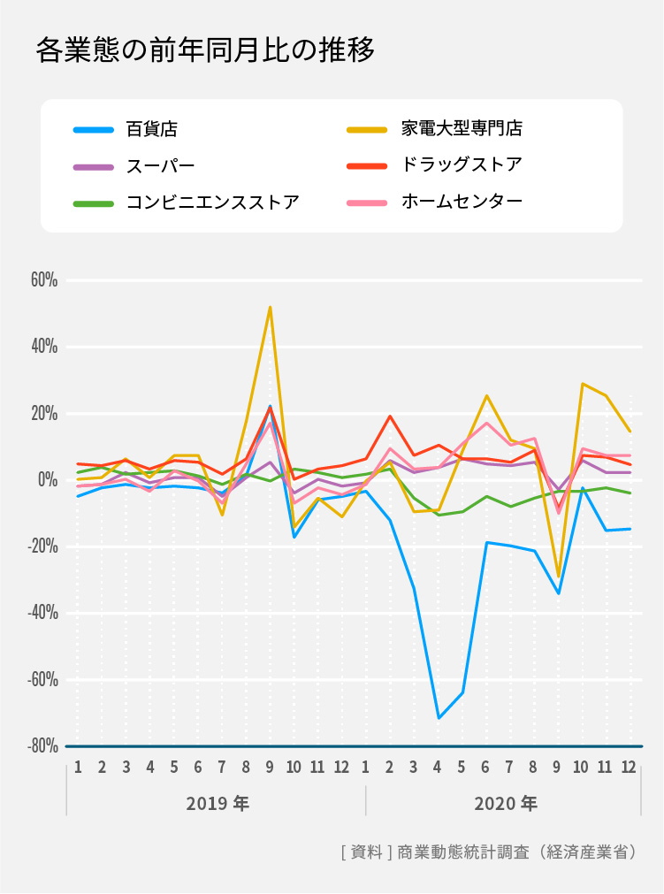 商業動態統計調査によると、昨年12月の小売業販売は、感染症の影響により、前年同月比▲0.2%と減少しています。しかし、業態別に見た場合、それぞれの特性により傾向に違いが見られます。