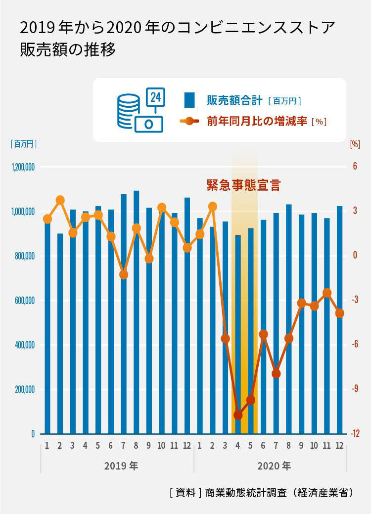 新型コロナウイルス感染症(以下、感染症という)の影響を受けた「withコロナ」の暮らしは、我々の生活にさまざまな変化を起こしています。前回の記事では、スーパーの飲食料品販売額の推移を見ながら、2020年における食品市場の変化を分析しました。今回は「コンビニエンスストア(以下、コンビニという)」に着目し、引き続き経済産業省が発表している「商業動態統計調査」をはじめとする統計データを活用して、コロナ禍におけるコンビニのあり方の変化を探ります。