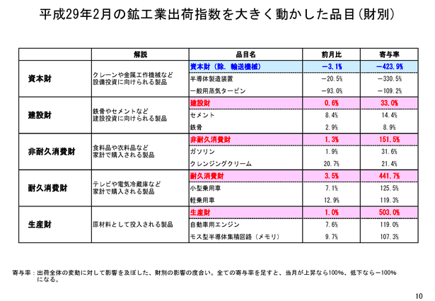 非耐久消費財ではガソリンやクレンジングクリームの出荷が良く、耐久消費財では、普通乗用車の出荷は前月比マイナスでしたが、小型乗用車、軽乗用車の出荷が好調で全体としてはプラスになっています。2月の小売販売は前月比0.2%上昇と上向いており、「持ち直しの動き」となっていましたので、2月の消費財需要は堅調だったということになるかと思います。