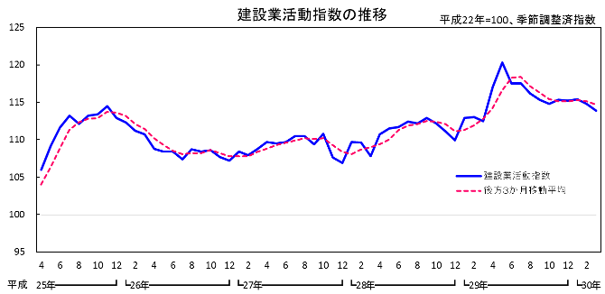 なお、30年第1四半期の建設業活動は、前月比マイナス0.3%と3期連続の低下、指数値は114.7でした。