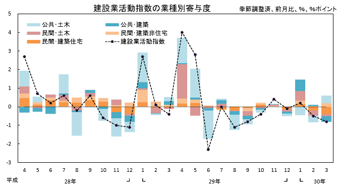 3月の建設業活動では、民間発注工事の活動が前月比マイナス1.3%と2か月連続の低下、国や地方公共団体等の発注する公共工事の活動が前月比0.2%と2か月ぶりの上昇でした。3月の建設業活動の前月比低下は、民間発注工事の1%を超える大幅低下によるものでした。
