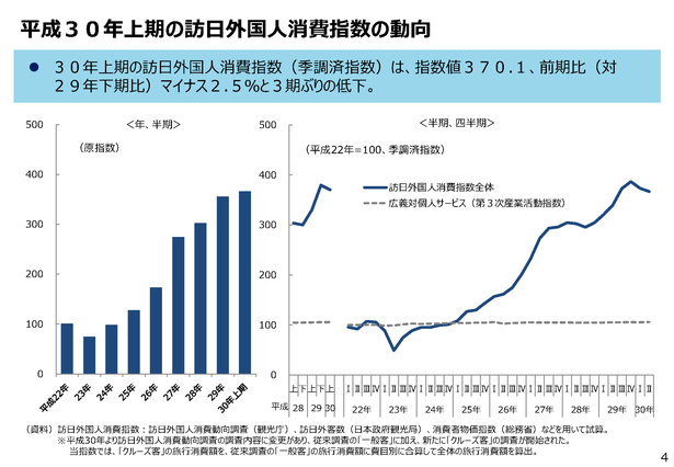 30年上期(1-6月期)の訪日外国人消費指数(平成22年平均=100)は、季調済指数値で370.1、前期比(対29年下期比)マイナス2.5%と3期ぶりの低下となりました。