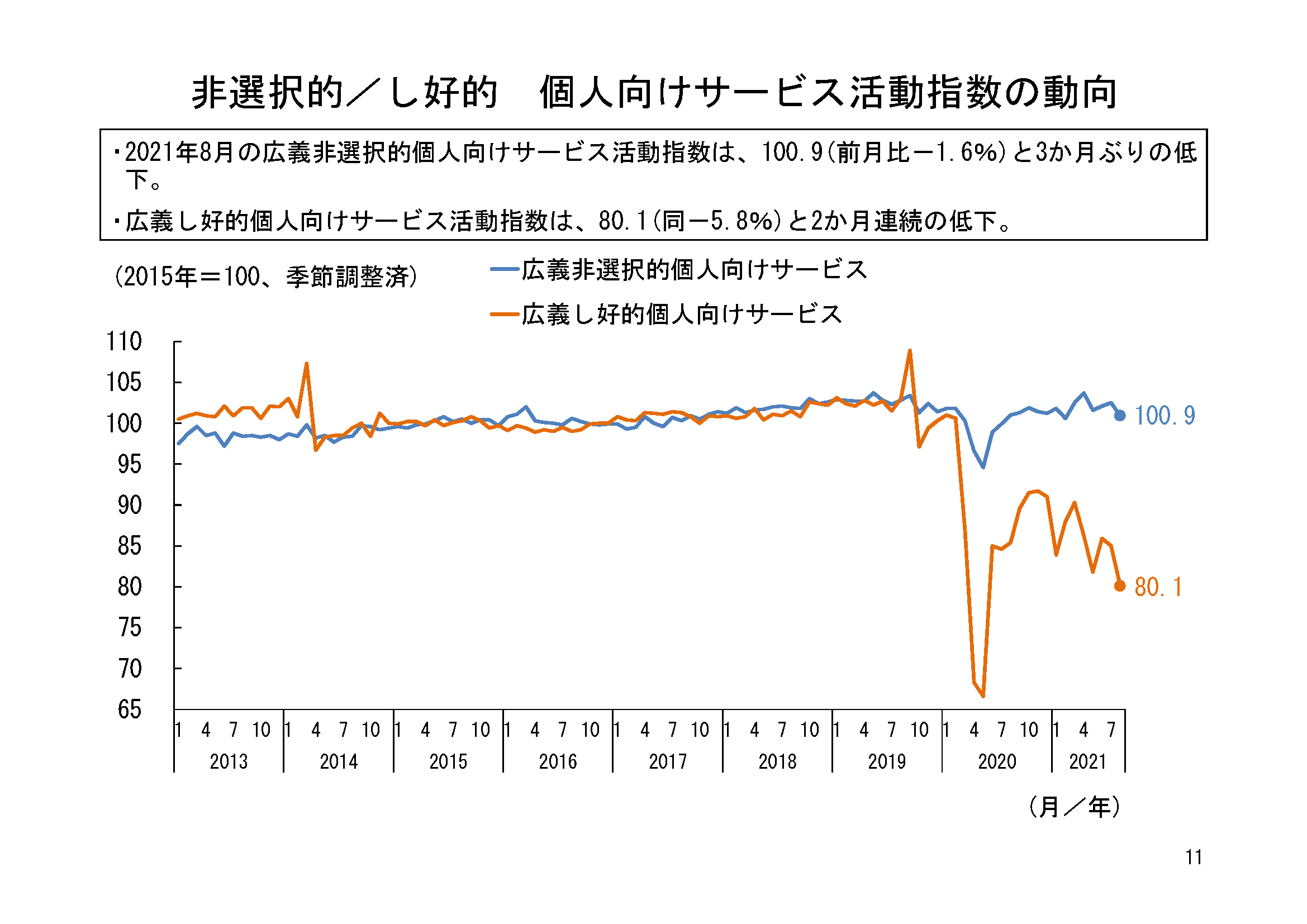 し好的個人向けサービスの低下は、大雨などの天候要因に加えて、緊急事態宣言の対象区域の拡大などを受けて、外食関連や娯楽関連、宿泊関連の活動が低調だったことによるものと考えられます。