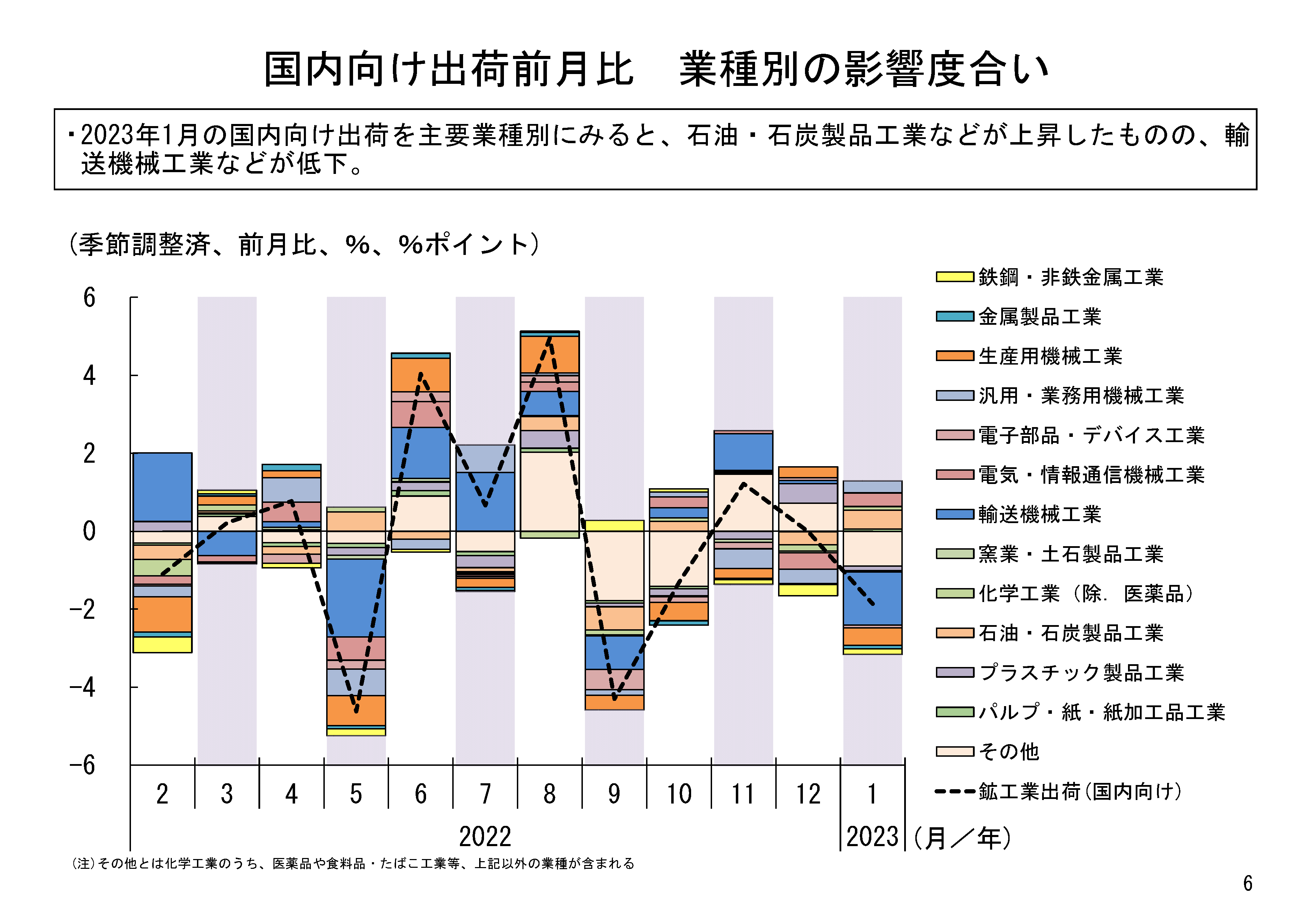 国内向け出荷で低下寄与が大きかった財別分類は、耐久消費財で、次いで生産財等が低下となりました。
