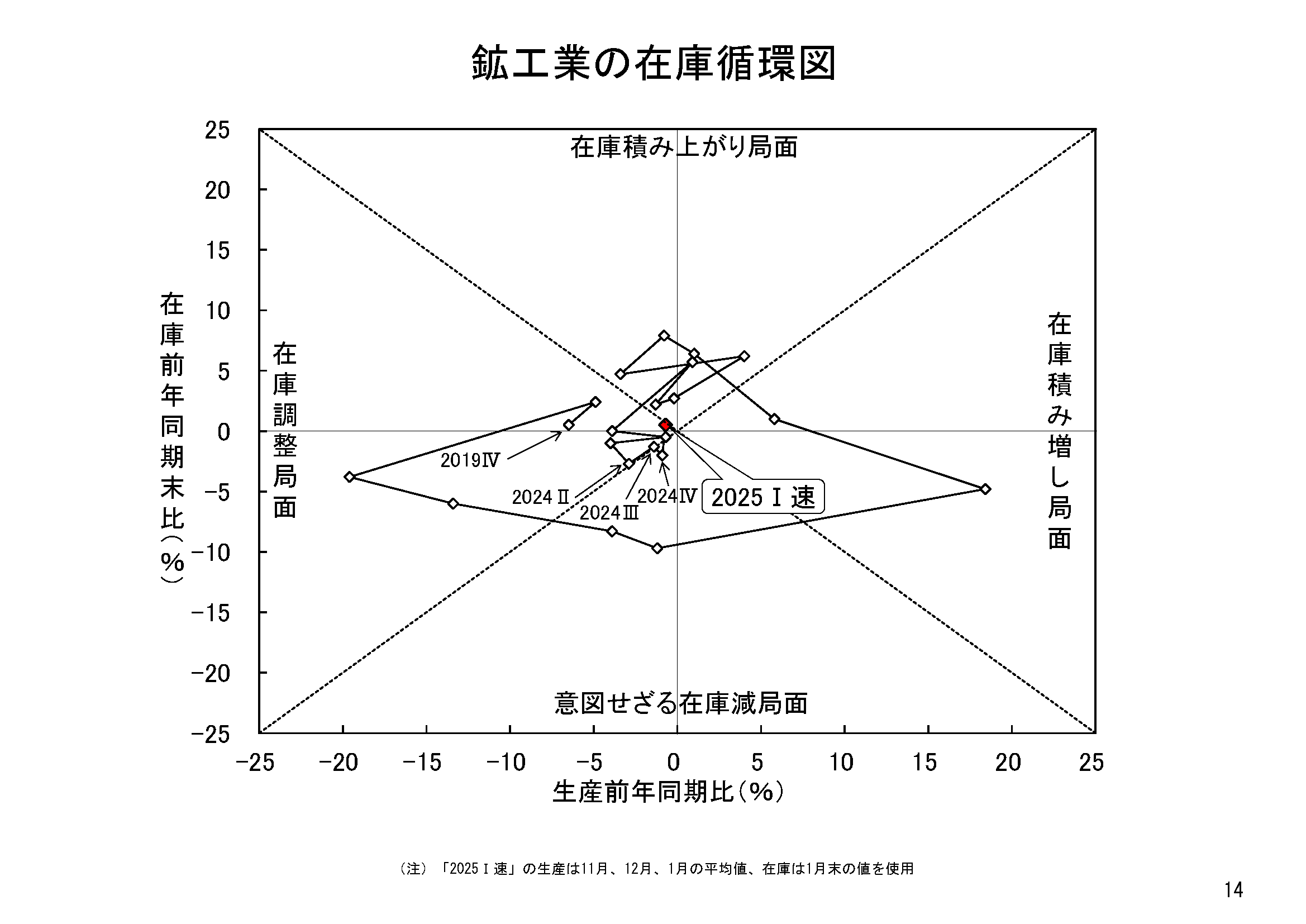 在庫循環図をみると、2021年第3四半期までは、「在庫積み増し局面」にあり、同年第4四半期から2023年第2四半期までの期間は、「在庫積み上がり局面」に位置していましたが、2023年第3四半期には、「在庫調整局面」に達し、2024年第4四半期には、「在庫調整局面」を抜け出て「意図せざる在庫減局面」に入りましたが、2025年第1四半期(速)では、再び「在庫調整局面」に逆戻りする結果となりました。