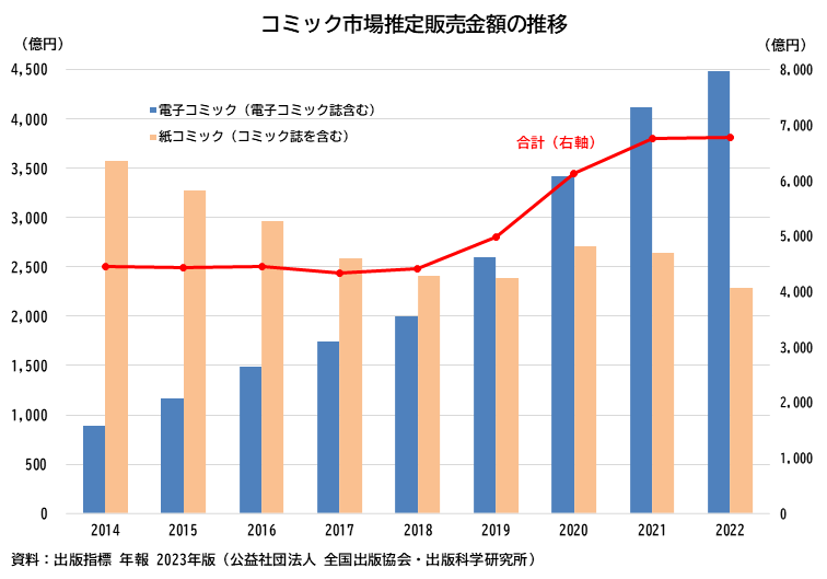 では、出版業界を支えている電子出版市場の内訳をさらに見てみましょう。電子出版市場の約8割をコミックが占めていますが、2020年以降さらに占有率が拡大し、2022年には全体の約9割をコミックが占めています。この背景として、コロナ禍の巣ごもり需要の影響が考えられます。また、コミック市場推定販売金額の推移より、2019年を境に電子コミックが紙コミックの販売金額を抜き、紙から電子への移行が進んでいることが読み取れます。