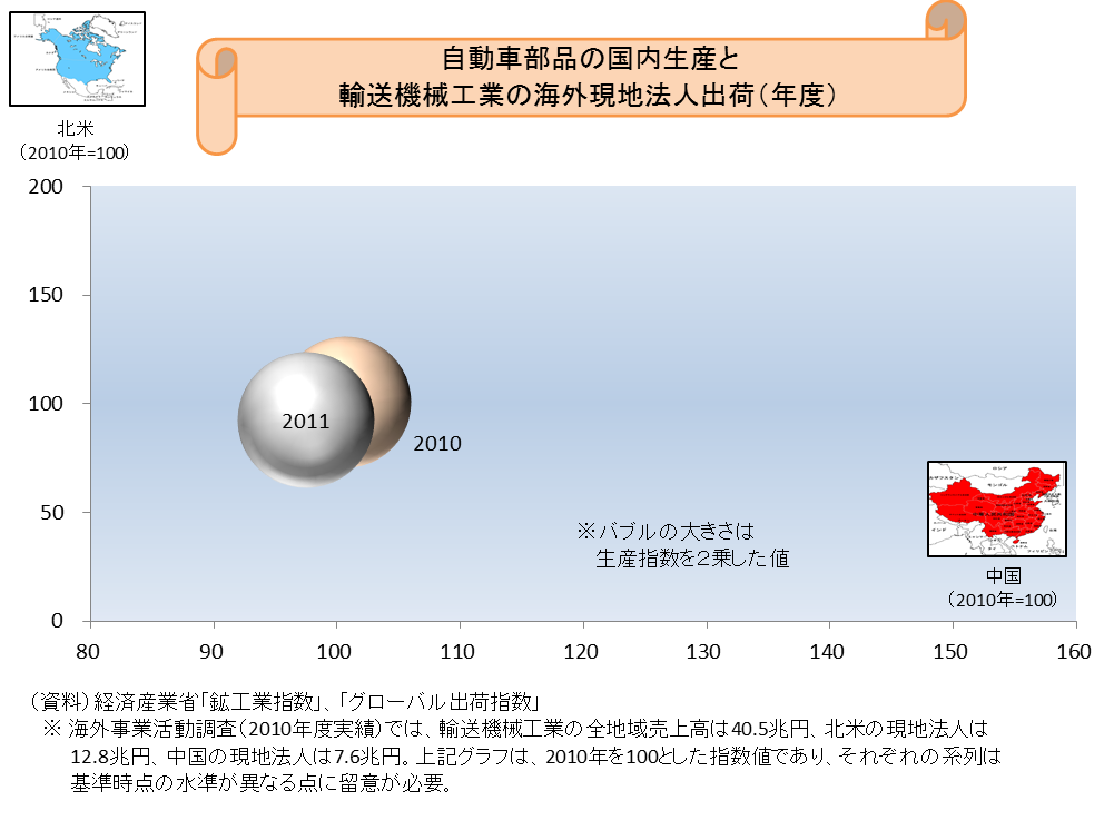 - 輸送機械工業は、他の産業に比べてグローバル化が進んでいます。そこで、自動車部品の国内生産と輸送機械工業の海外現地法人の出荷、特に北米現地法人、中国現地法人の出荷の関係を「動くバブルチャート」で「見える化」してみました。