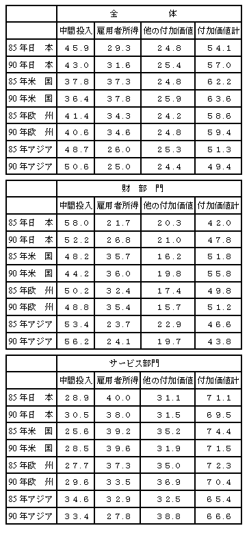 各国・地域の投入構造の違いを、85年から90年までの5年間の変化でみると(図表2-1)、日本、米国、欧州の3か国・地域では中間投入率が低下し、付加価値率が上昇している。
