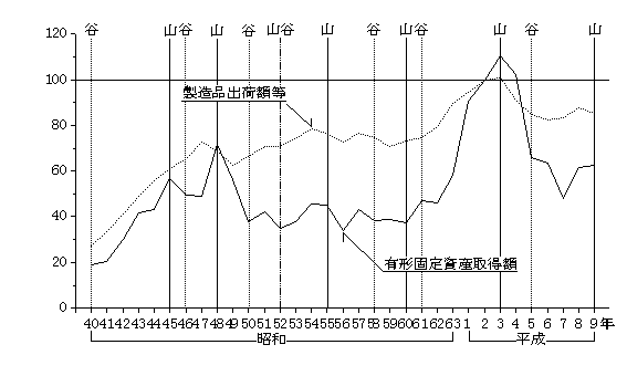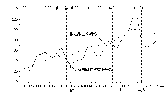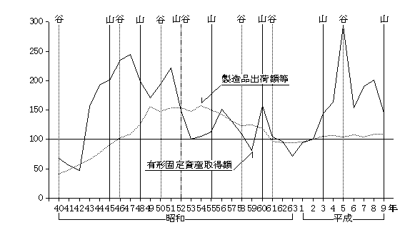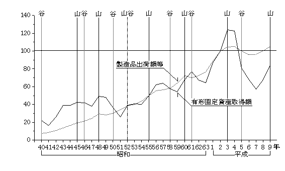 - 16) 電気機械器具製 造業の出荷額は、バブル期の平成3年まで一貫して増加が続き、バブル崩壊後の4年、5年には減少、以降大幅な増加が続いている。投資額は、いざなぎ景気か ら列島改造ブーム及びオイルショック時に小さな山、円高不況前後及びバブル期には大きな山がみられた。