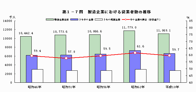 - なお、従業者数からみた中小企業の割合(ウェィト)は、昭和48年調査に80.0%を示した後一貫して減少し、平成10年調査では60.4%となった。