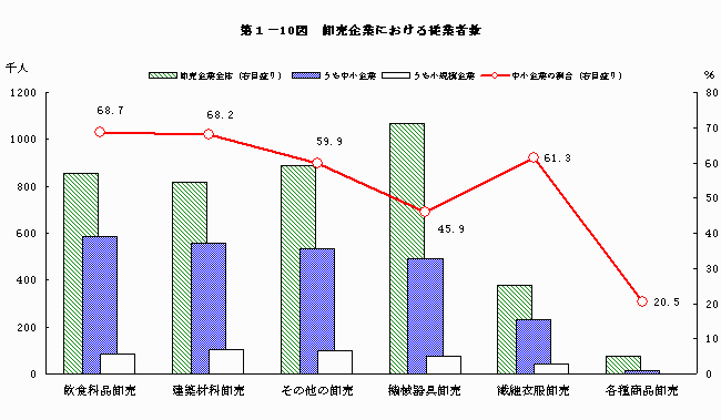 - なお、従業者数からみた中小企業の割合(ウェィト)は、昭和61年調査の70.7%をピークに減少傾向にあり、平成4年調査では61.3%、平成10年調査では59.2%となった。