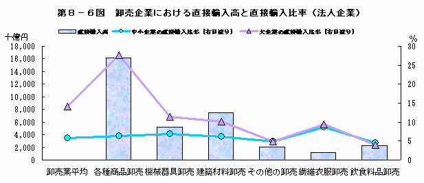 次に、卸売企業における直接輸入高は34兆3千億円となった。これを業種別にみると、各種商品卸売業の16兆2千億円が抜きんでて多く、この業種だけで直接輸入高の半分を占めている。これは、多様な商品を幅広く取り扱って国際的な取引を行う総合商社を含んでいるためである。